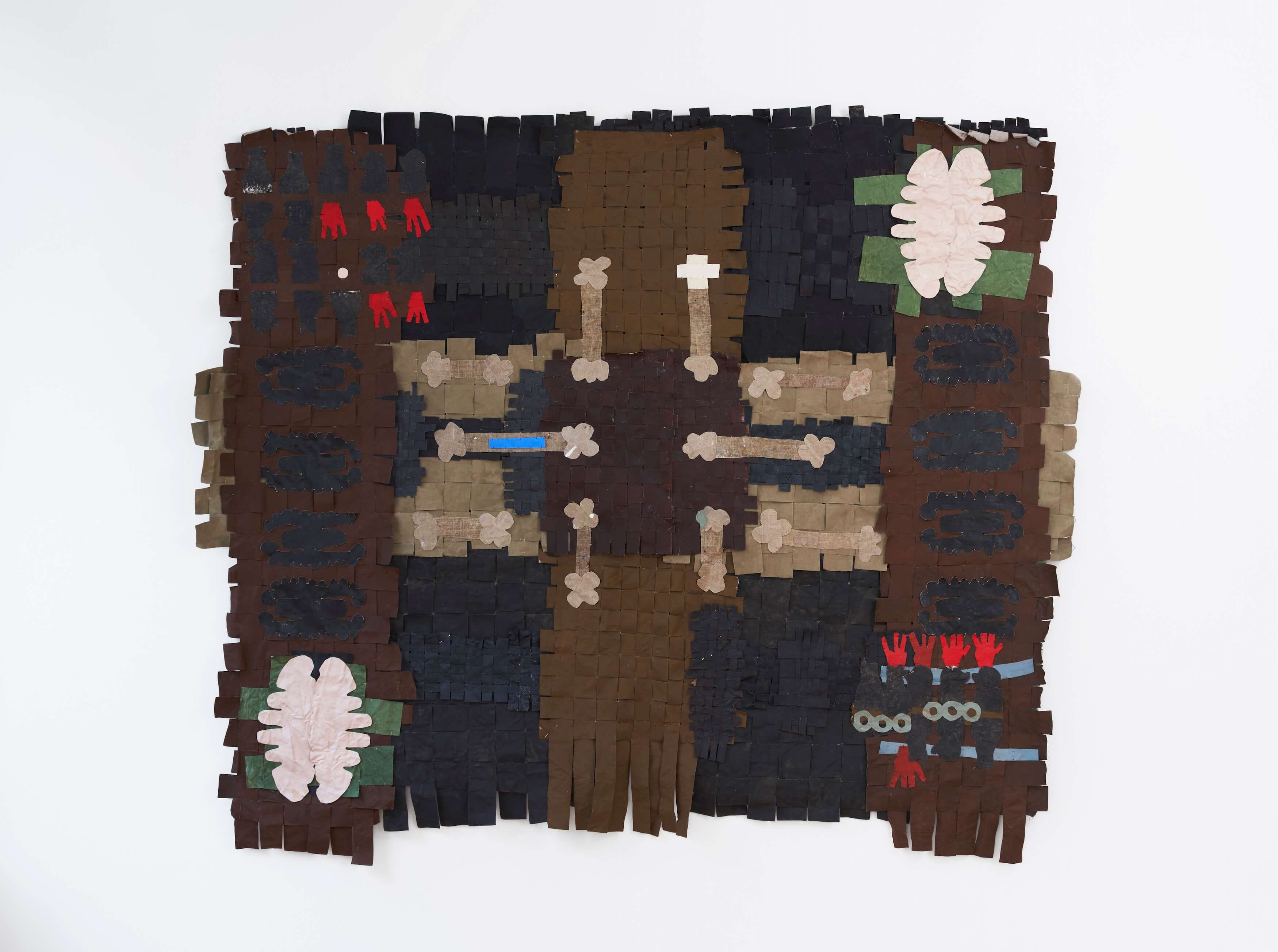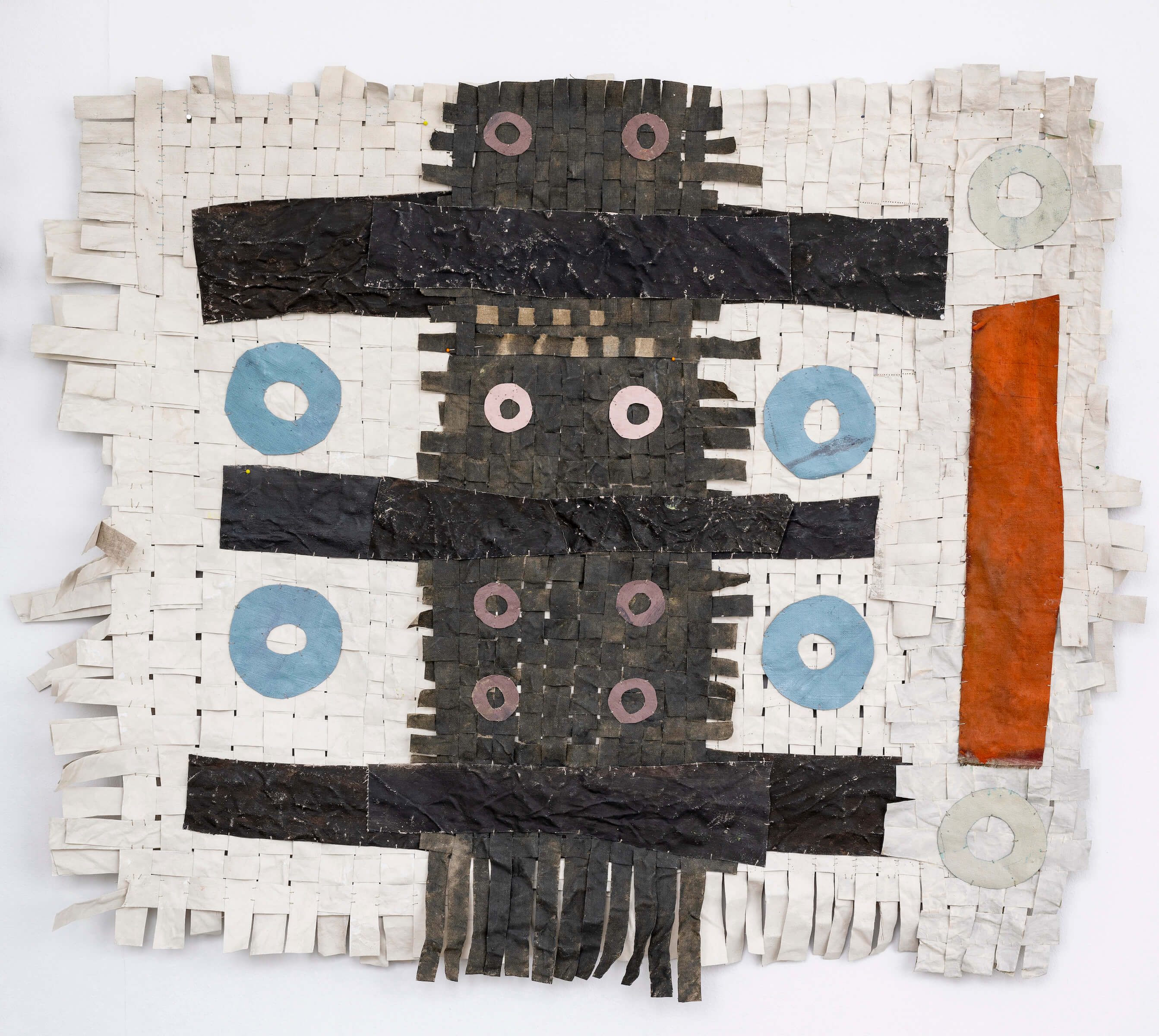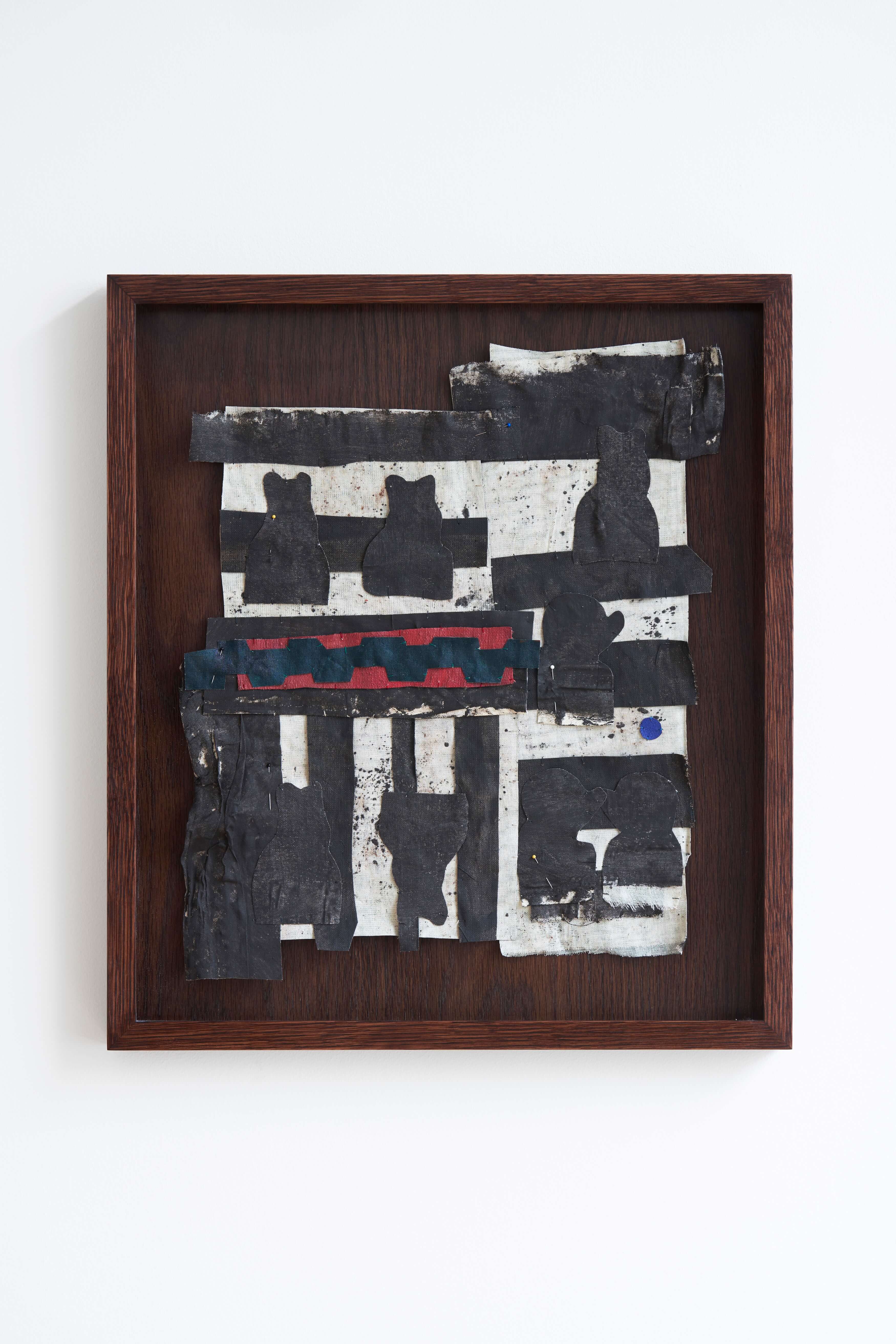 "Operating the field of painting like the frame of a sturdy loom, Some Images, Some Manuals suggests a space of broad and fathomless encounters - one that simultaneously encases its conversations and lets them boundlessly reverberate.This structure unmakes the artist herself: lacing depersonalised scraps of her own biography into the historical frames of men, Jauncems’ woven pantings cradle masculine frailty and point to the holes in the fabric of hierarchical, finite representation, leaving objects whose philosophical reflection is rooted in the interplay between muted colours and shoes, grounded in the physicality of suture."