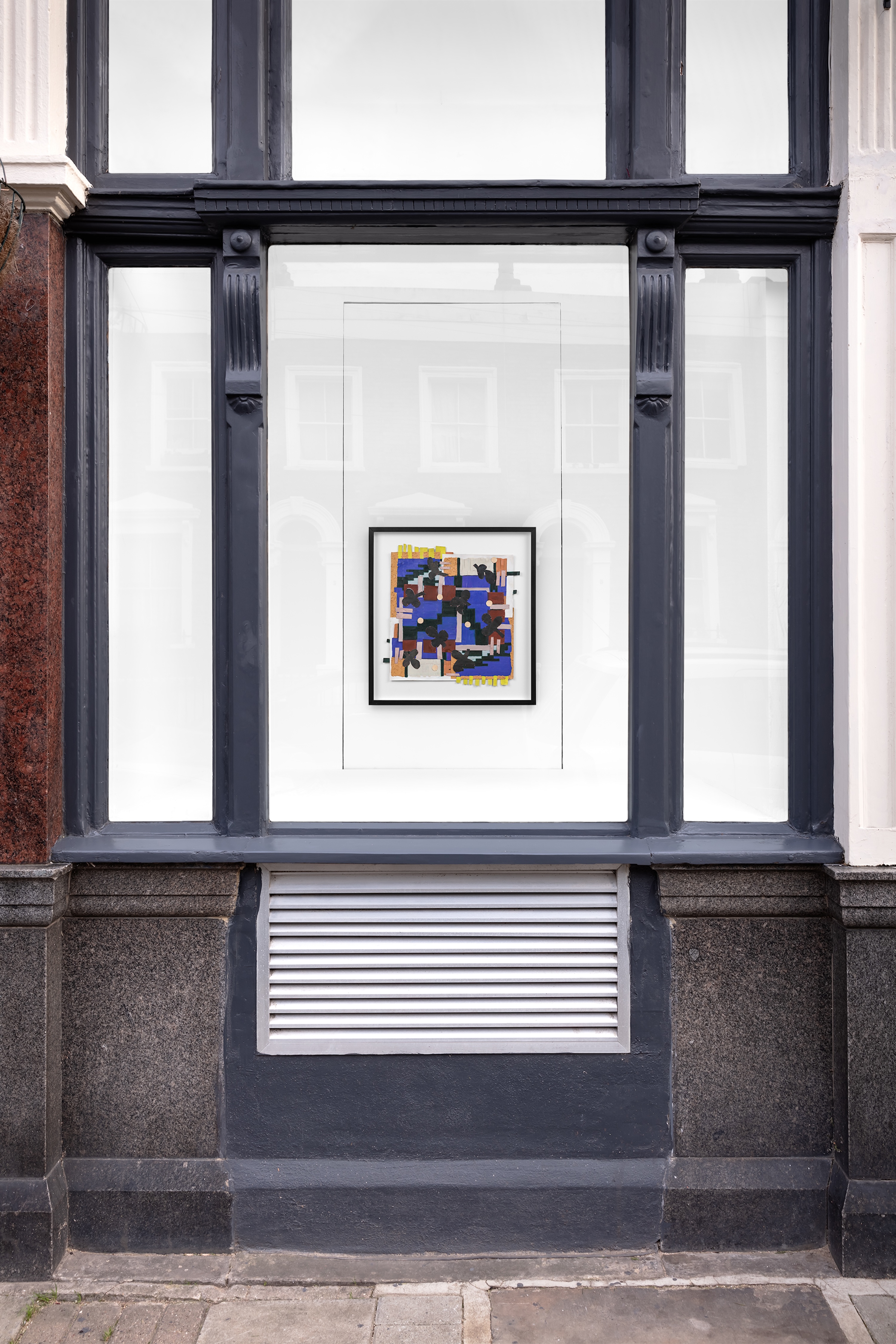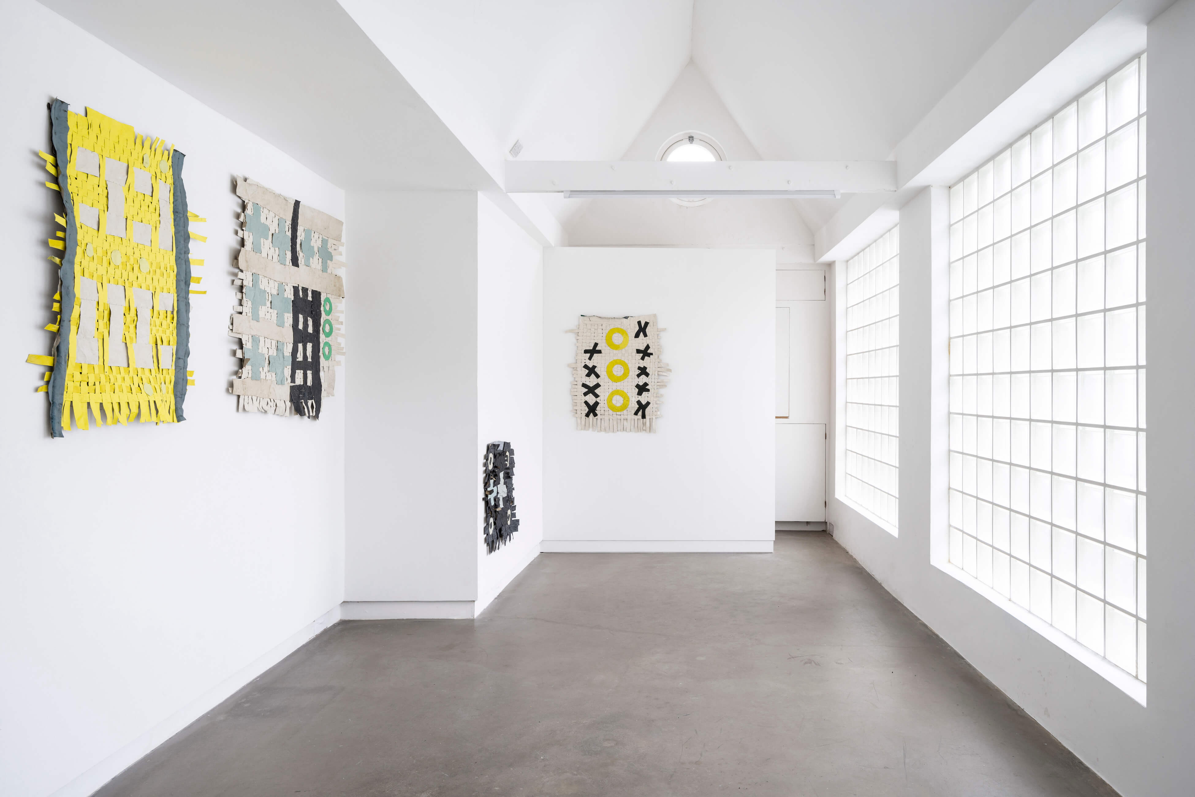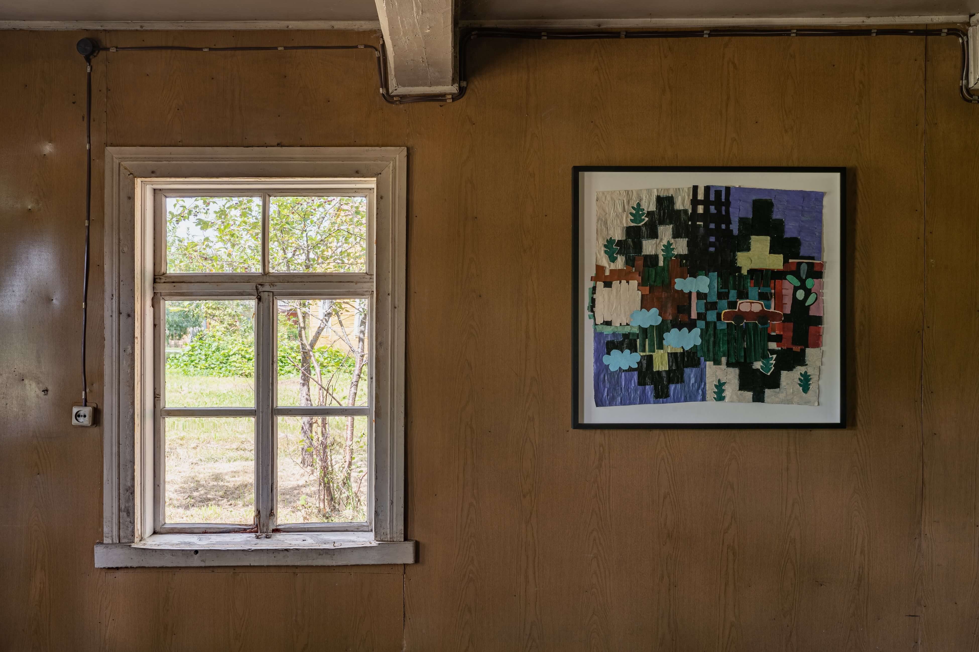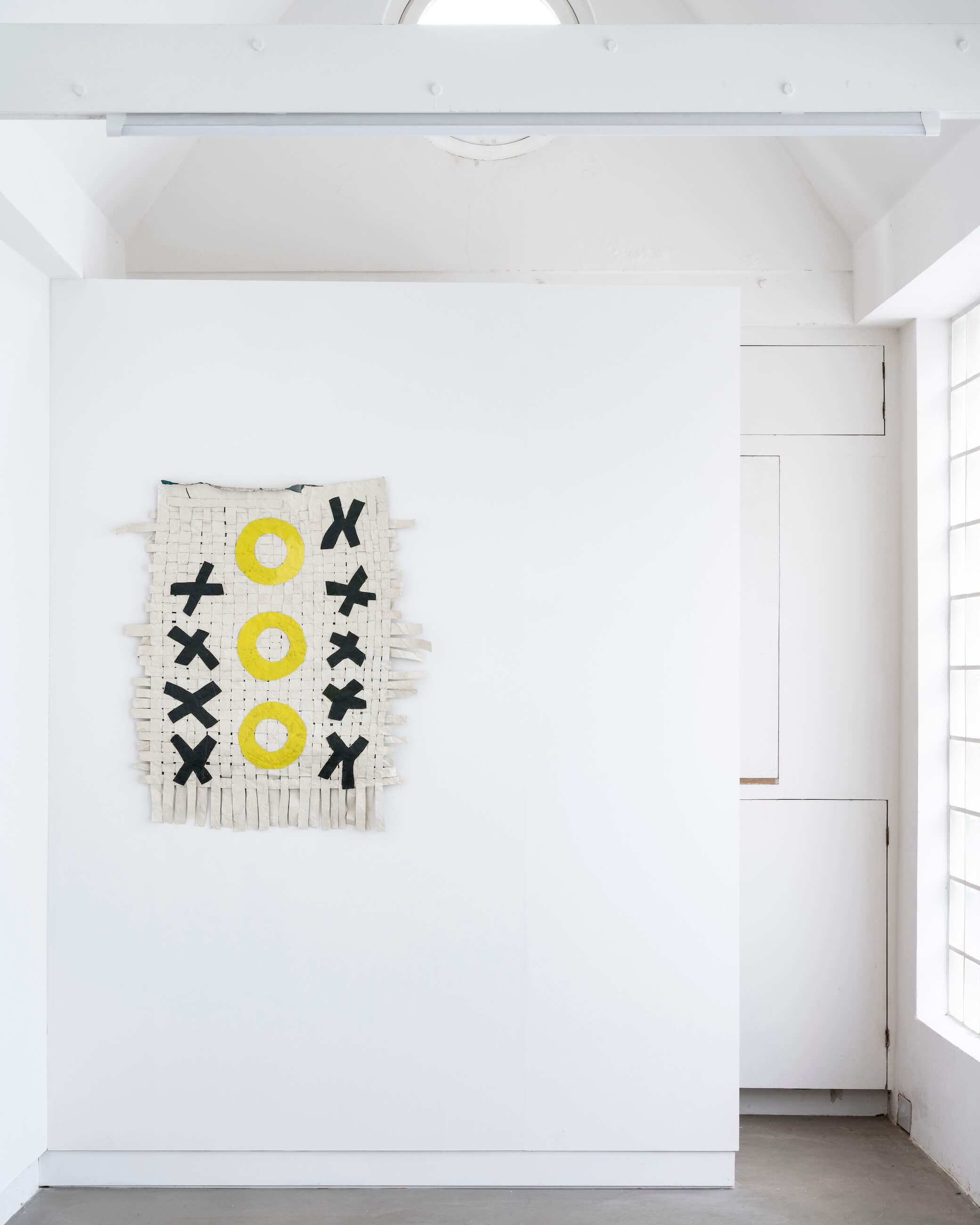 "In the window display, Jauncems presents Untitled, a piece from a recent series of works influenced by Paulinas Kaluina (1933-2017). Kaluina produced over two hundred sheets of drawings of various weaving patterns that sadly were never materialised. Intrigued by Kaluina’s personality and the playful nature of the patterns, Jauncems reinterpreted these drawings. Weaving together paper and canvas has opened the artist’s approach to painting and application techniques, allowing Jauncems to play with the language of symbols used by another person from another time."