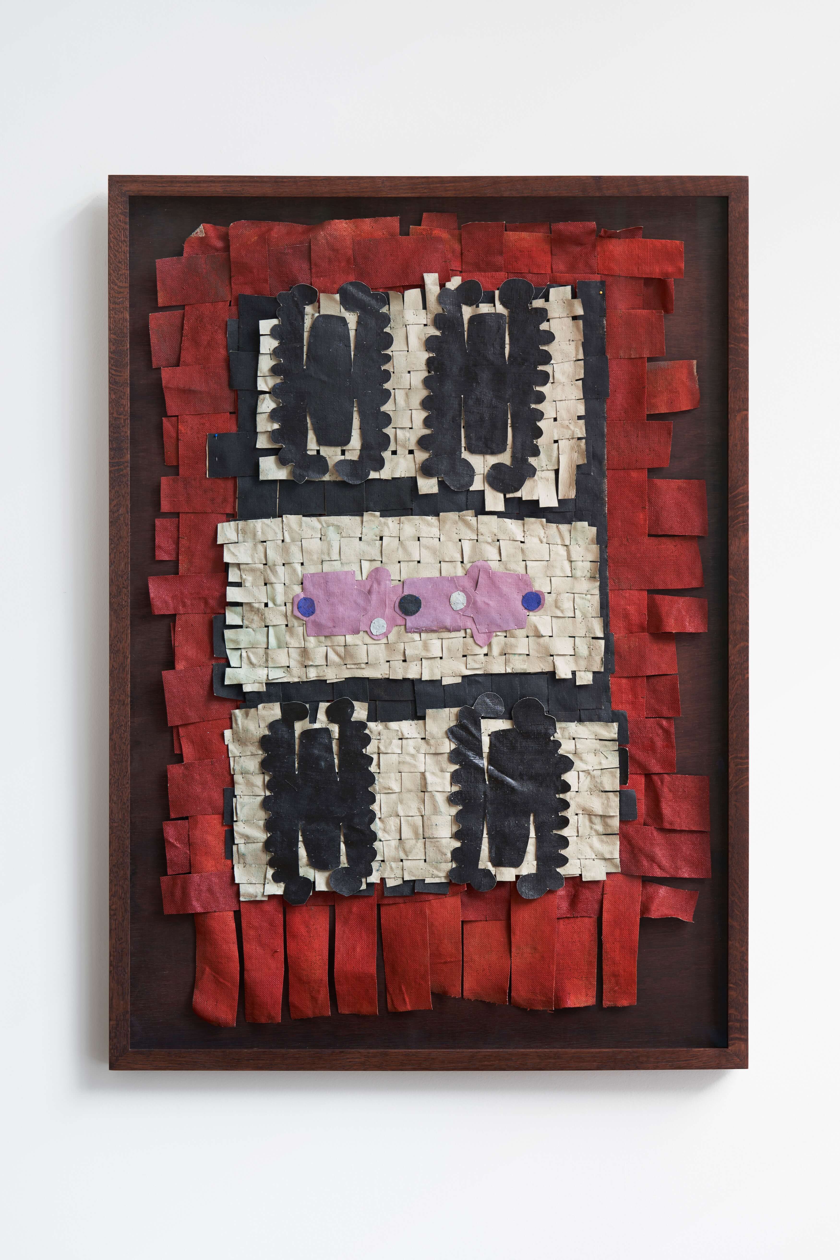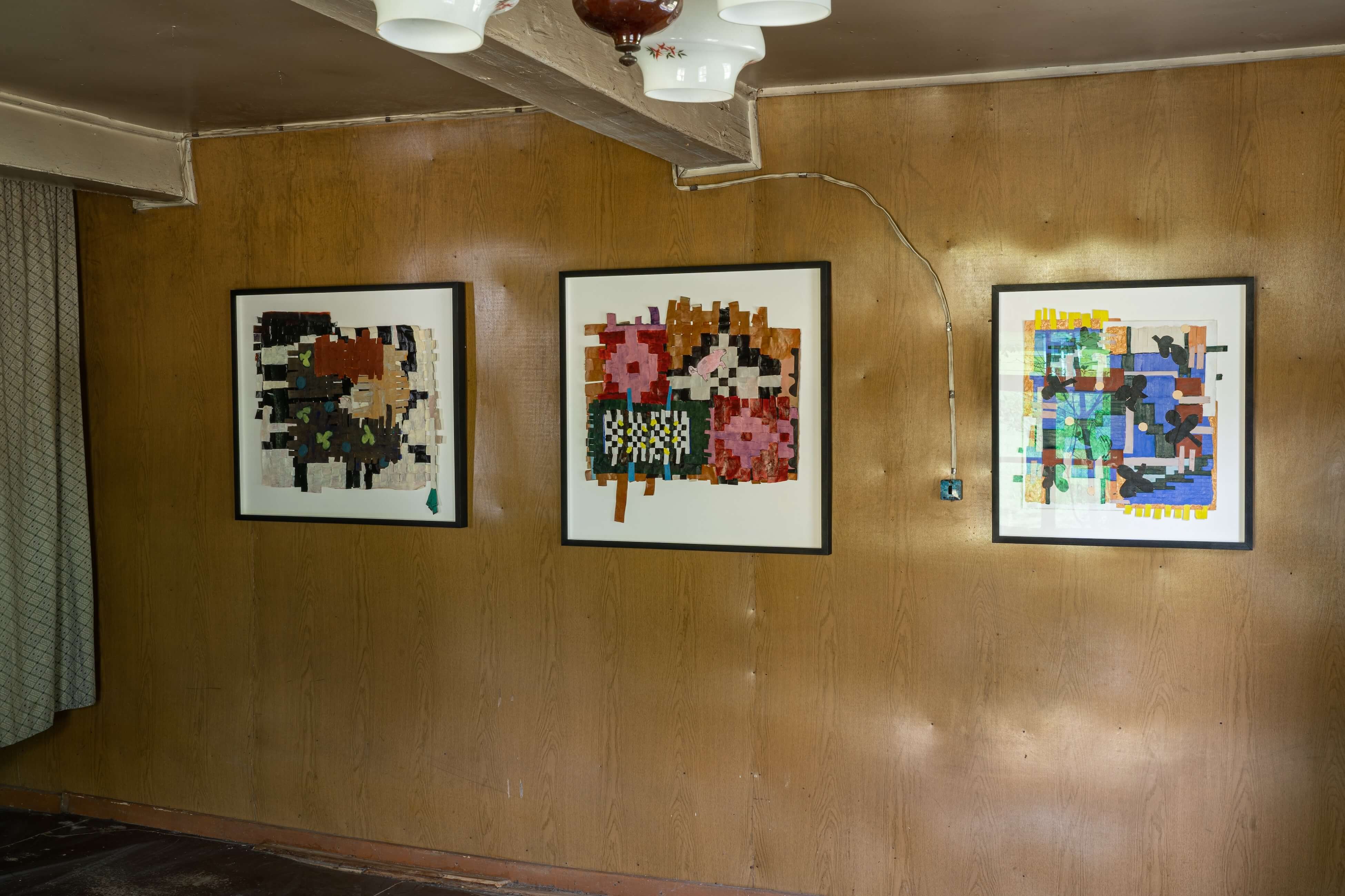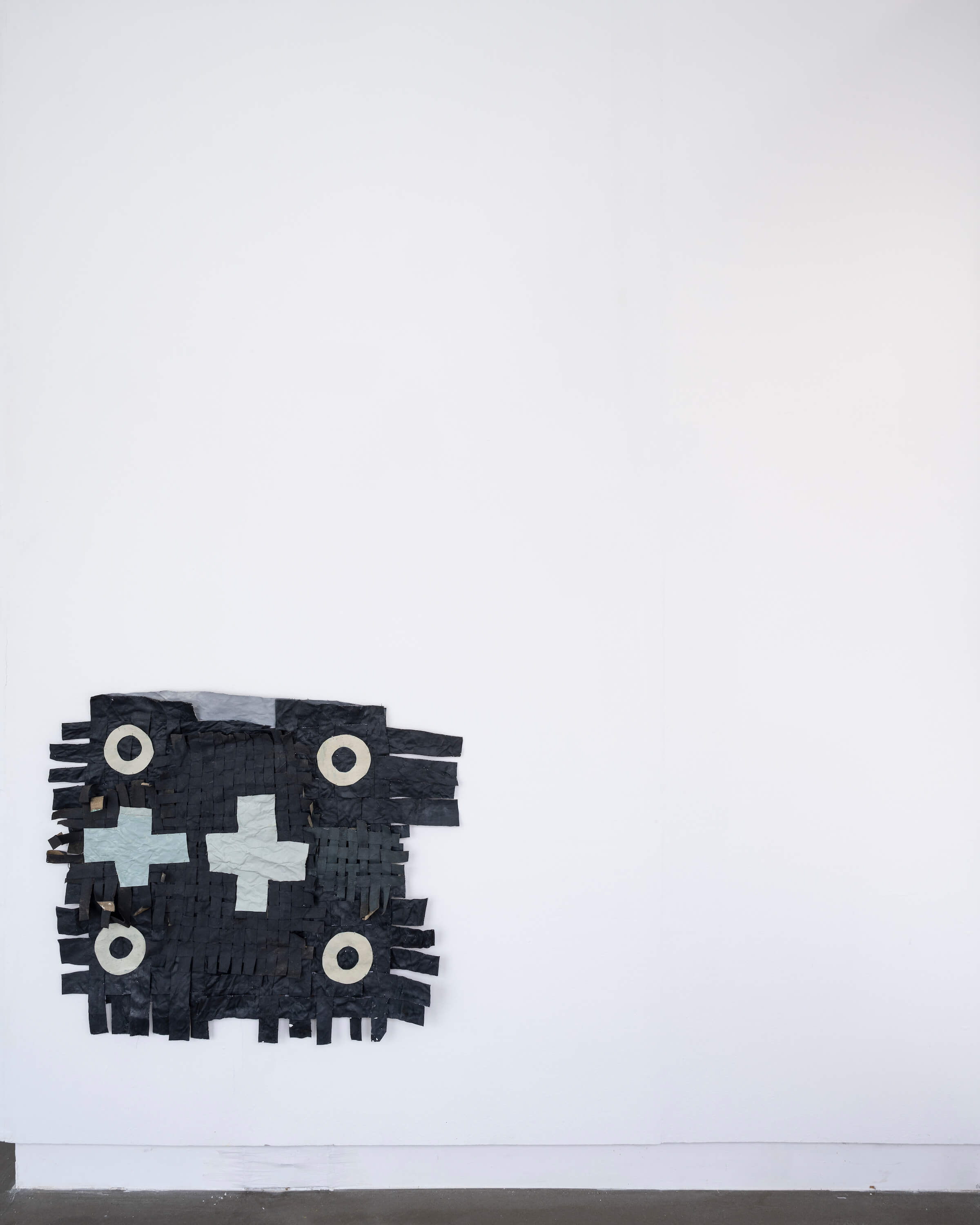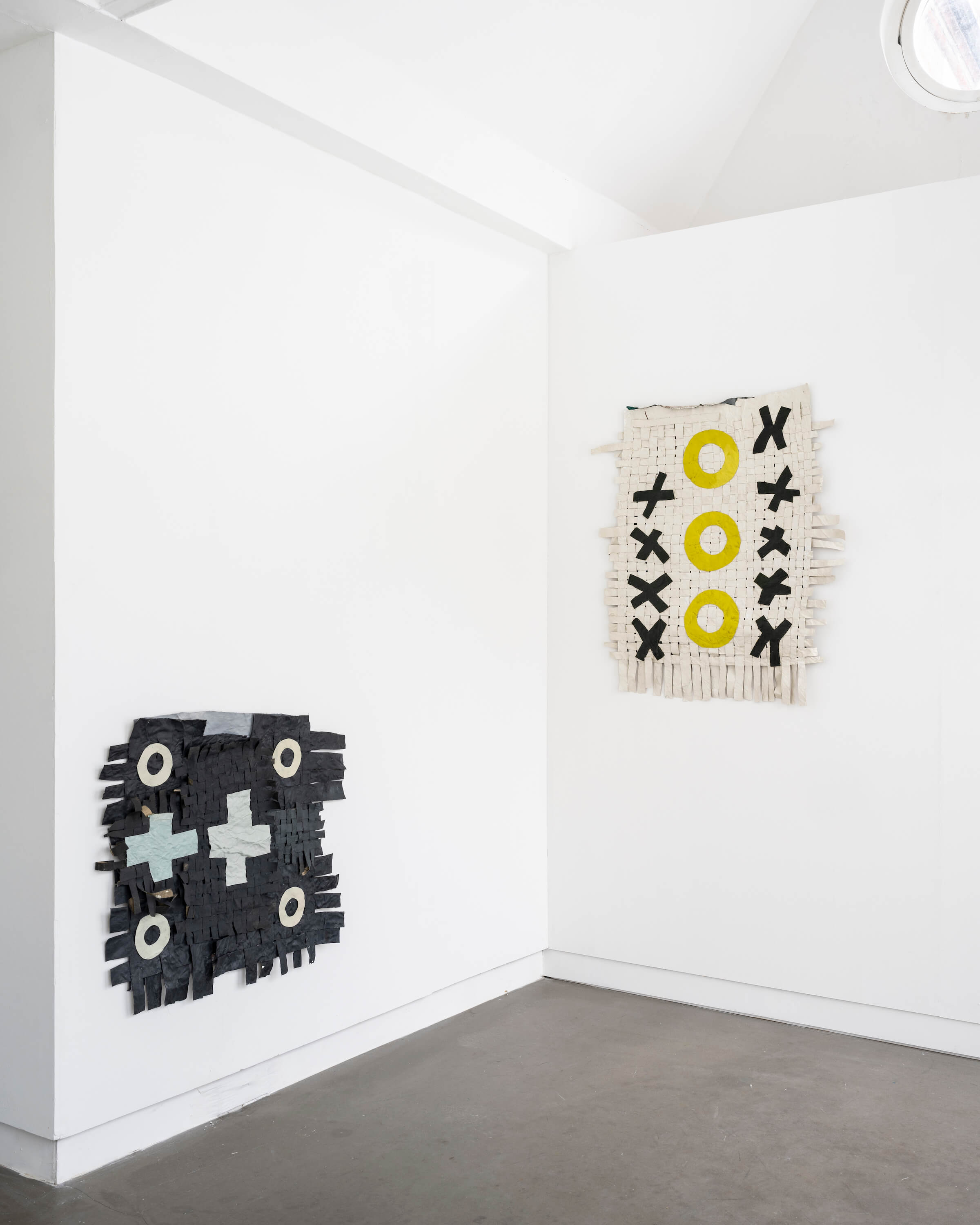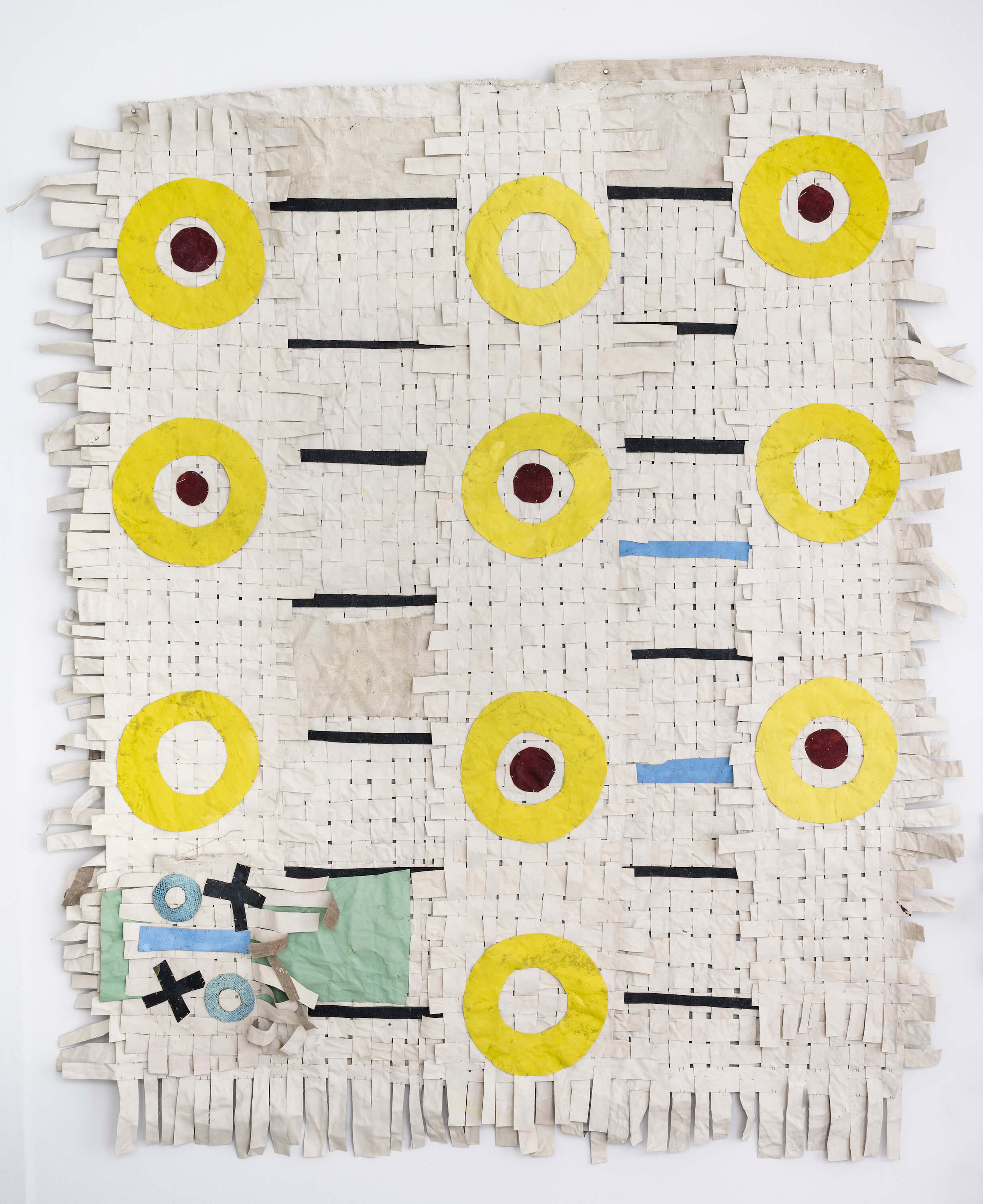 "In the window display, Jauncems presents Untitled, a piece from a recent series of works influenced by Paulinas Kaluina (1933-2017). Kaluina produced over two hundred sheets of drawings of various weaving patterns that sadly were never materialised. Intrigued by Kaluina’s personality and the playful nature of the patterns, Jauncems reinterpreted these drawings. Weaving together paper and canvas has opened the artist’s approach to painting and application techniques, allowing Jauncems to play with the language of symbols used by another person from another time."
