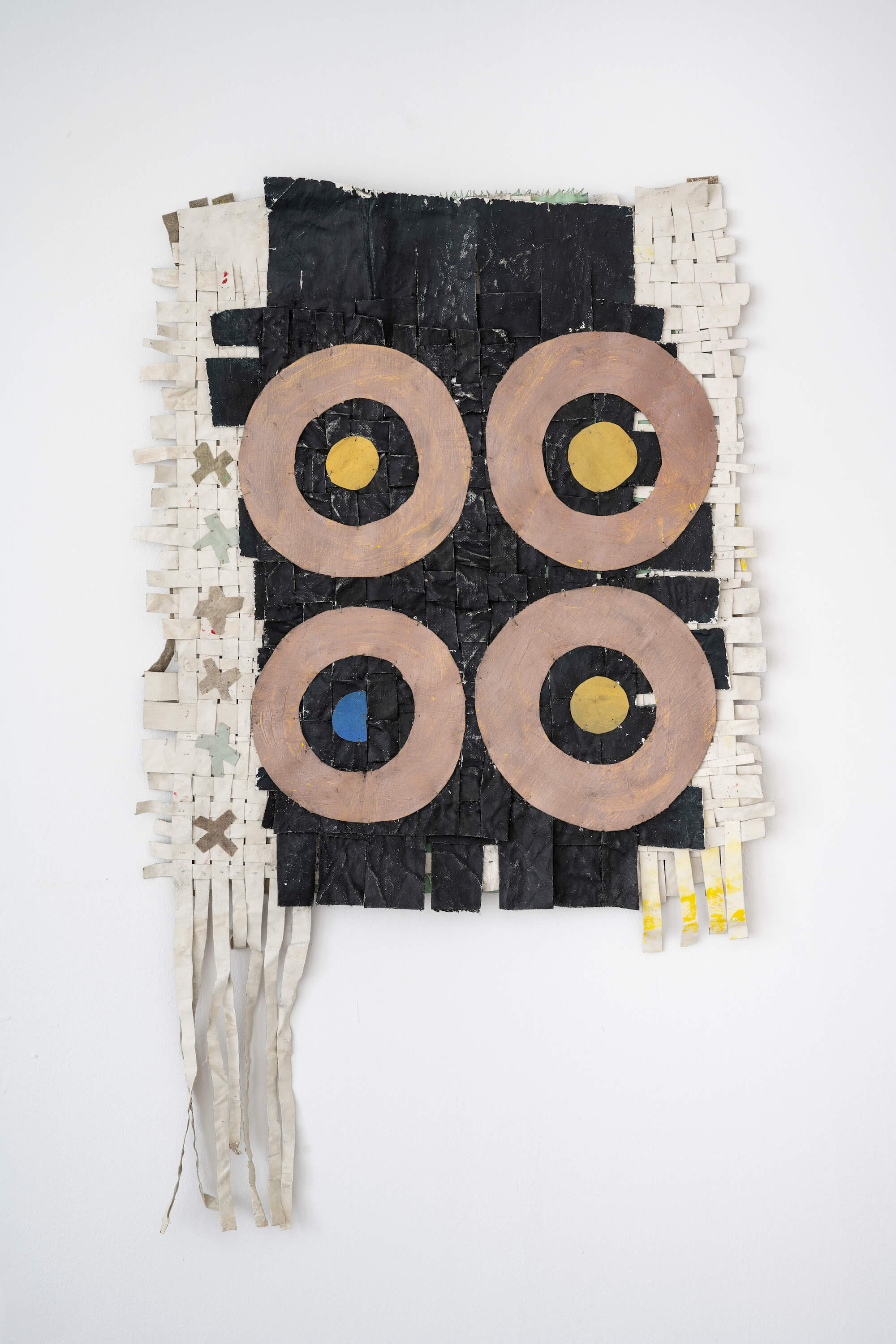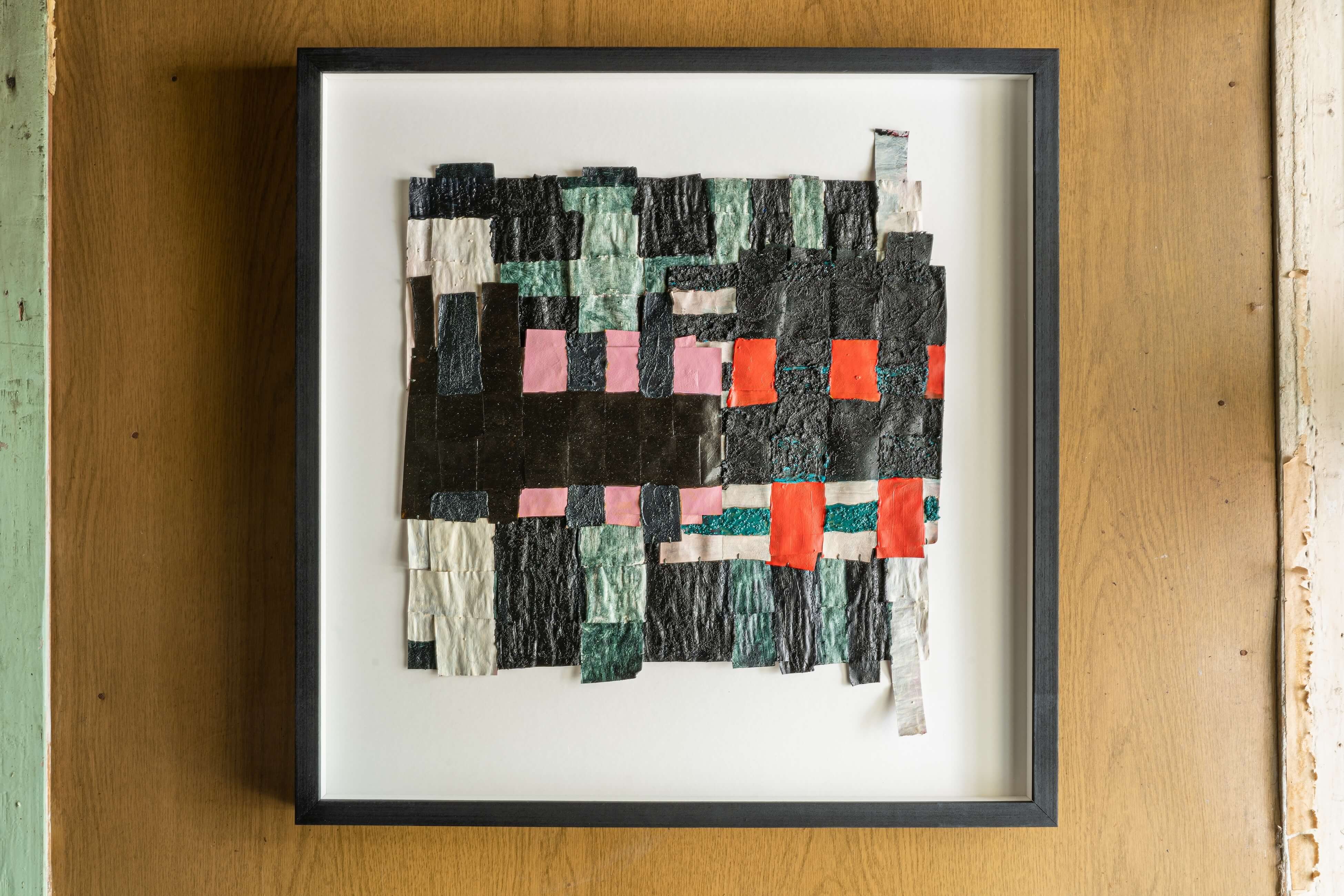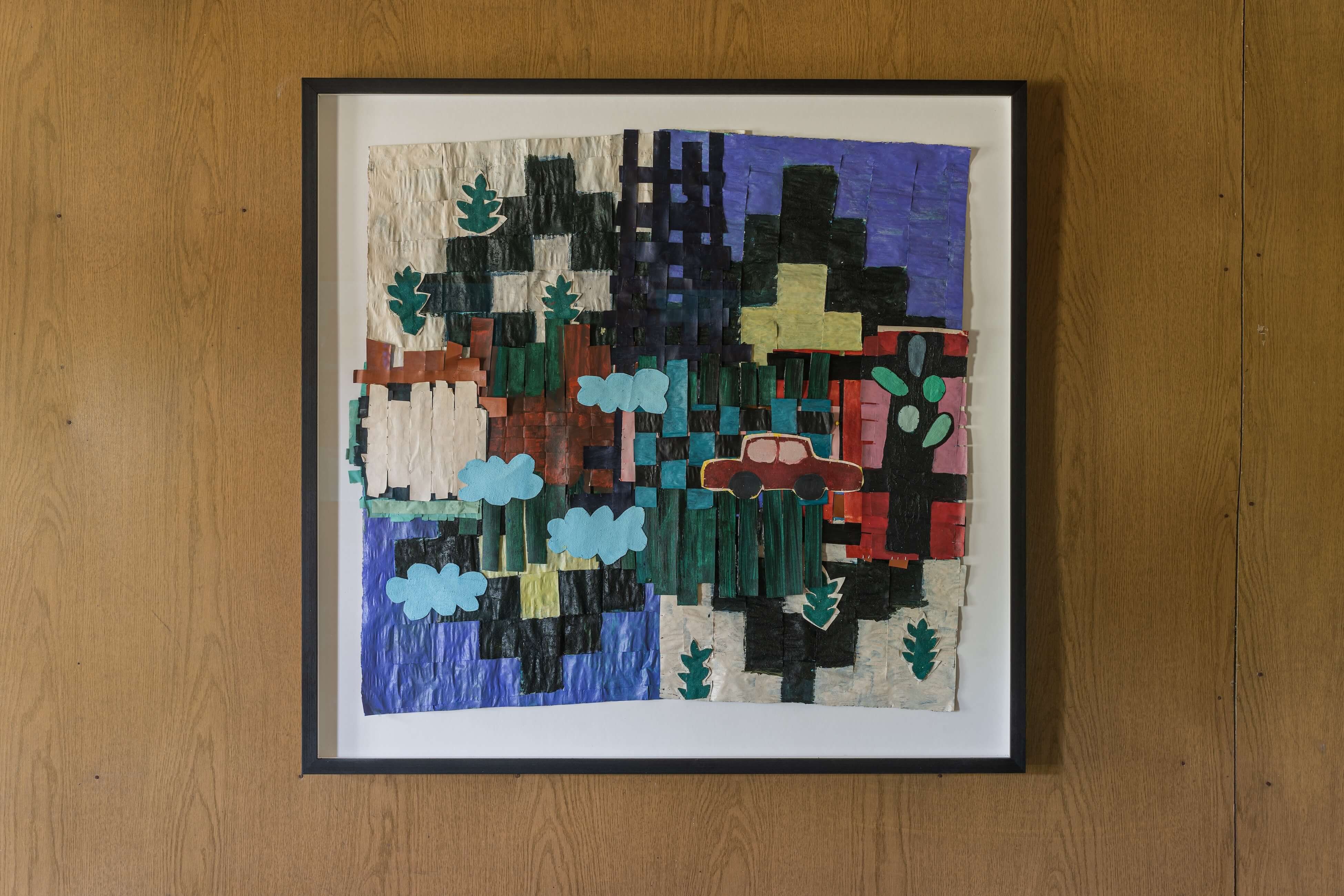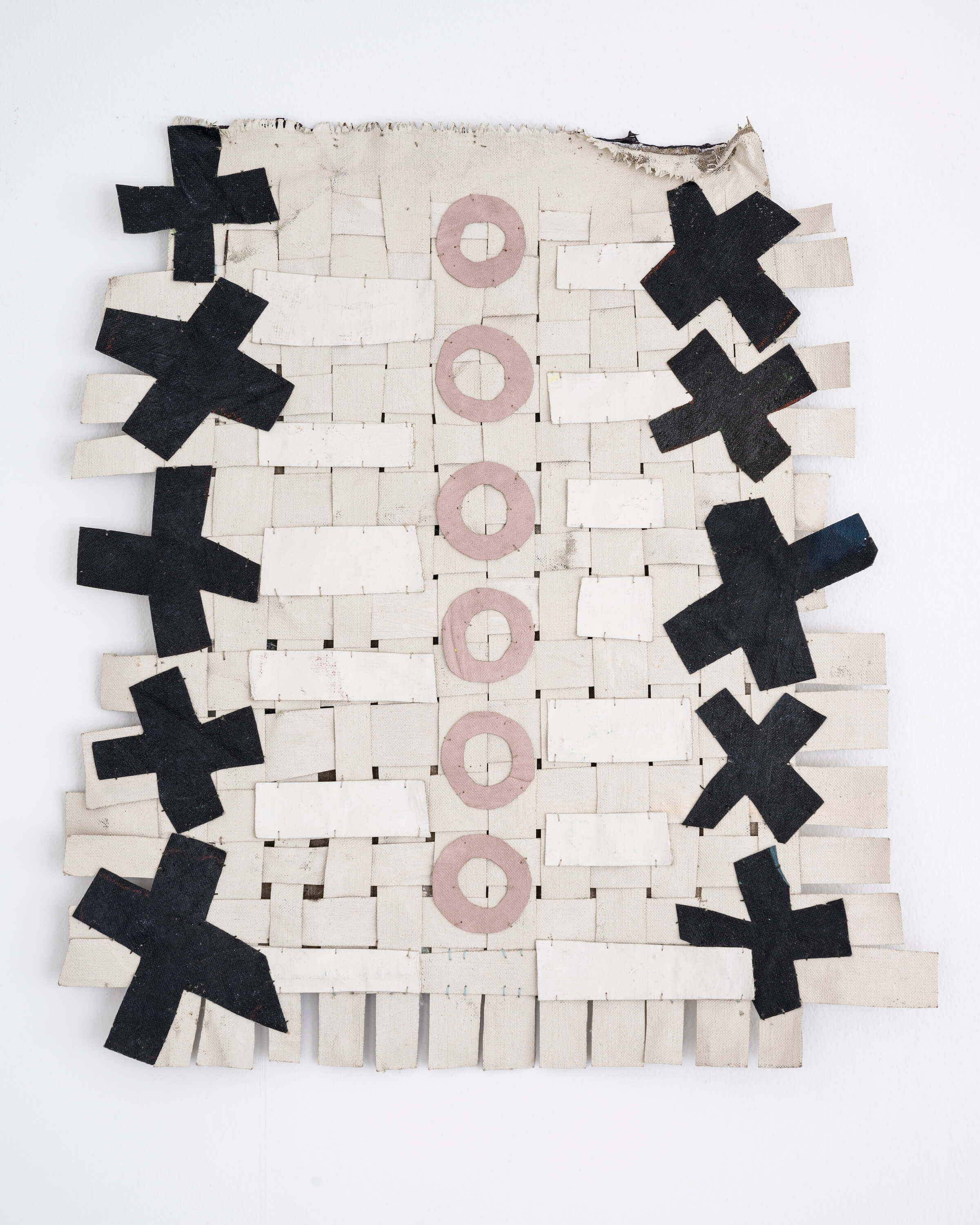 "In the window display, Jauncems presents Untitled, a piece from a recent series of works influenced by Paulinas Kaluina (1933-2017). Kaluina produced over two hundred sheets of drawings of various weaving patterns that sadly were never materialised. Intrigued by Kaluina’s personality and the playful nature of the patterns, Jauncems reinterpreted these drawings. Weaving together paper and canvas has opened the artist’s approach to painting and application techniques, allowing Jauncems to play with the language of symbols used by another person from another time."