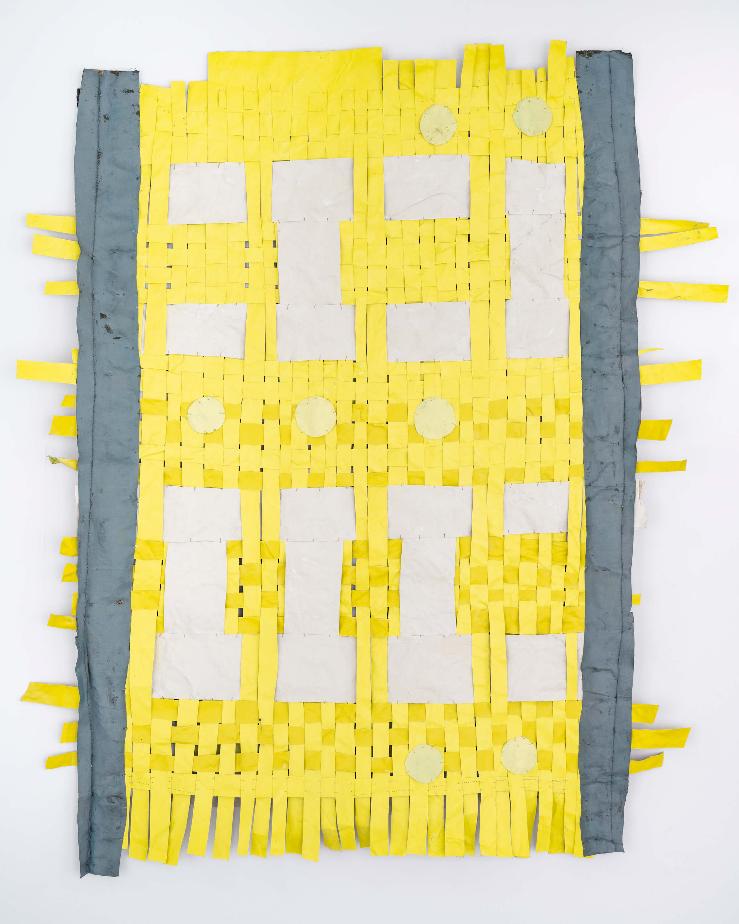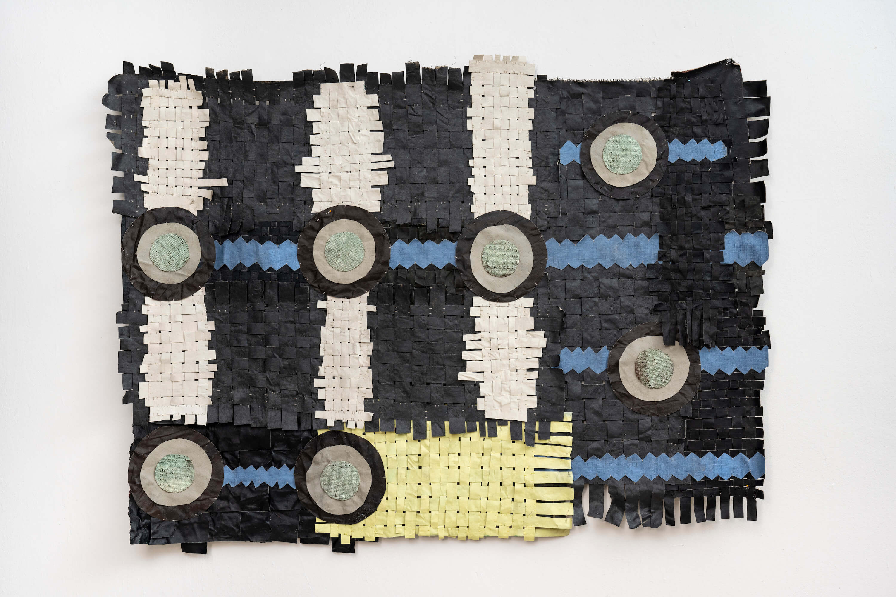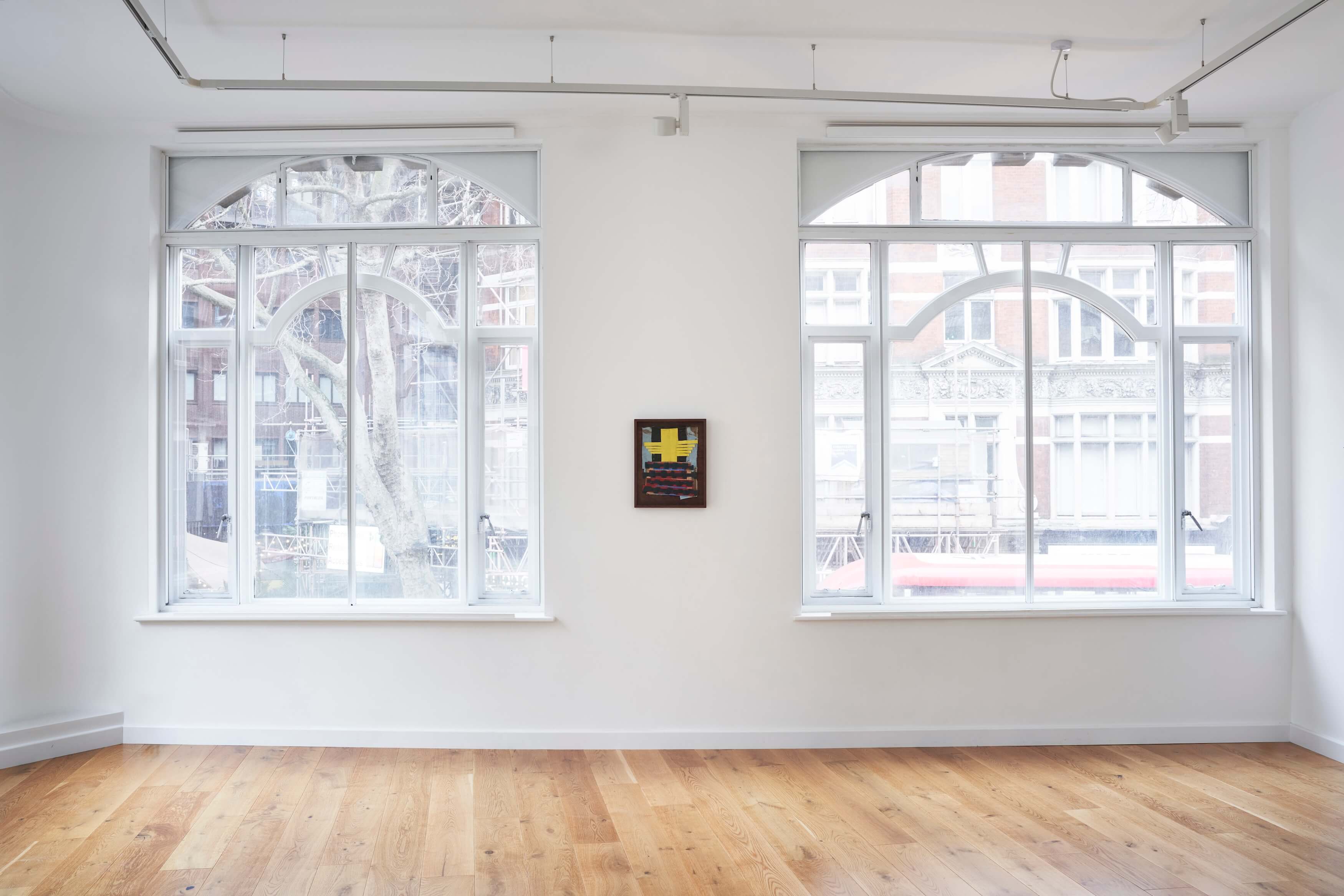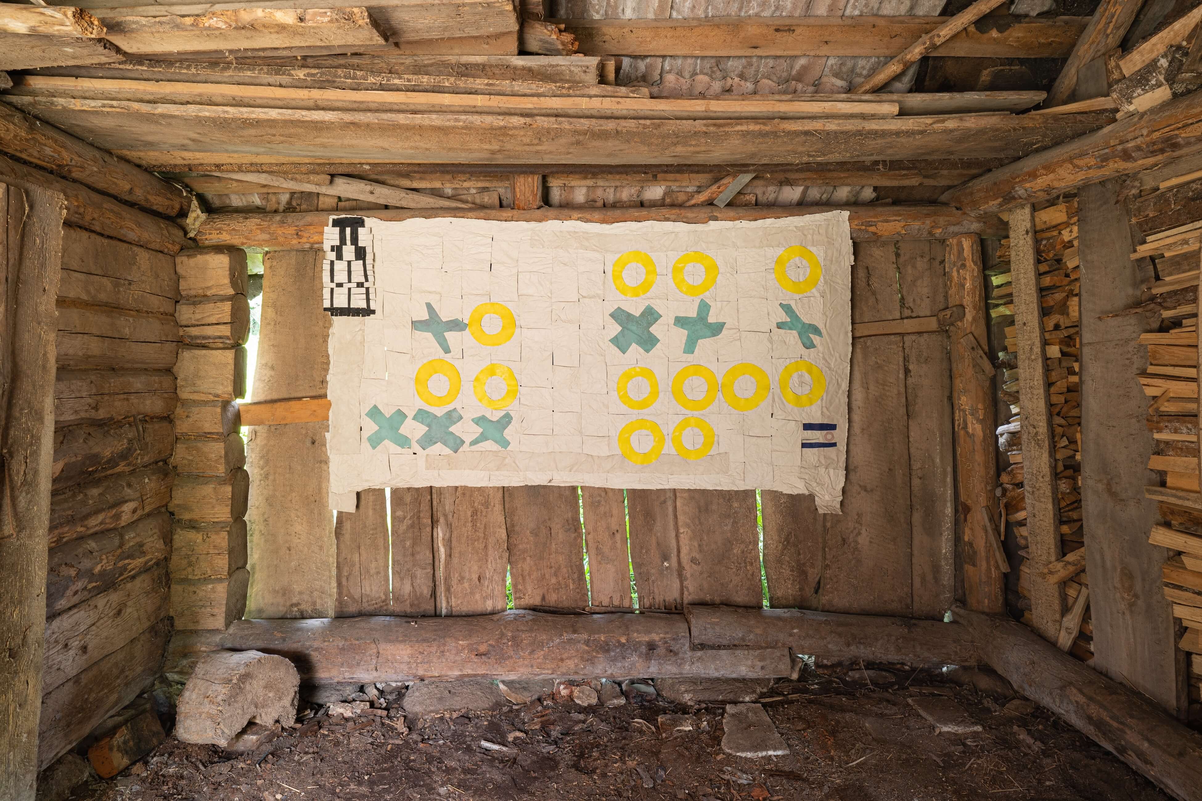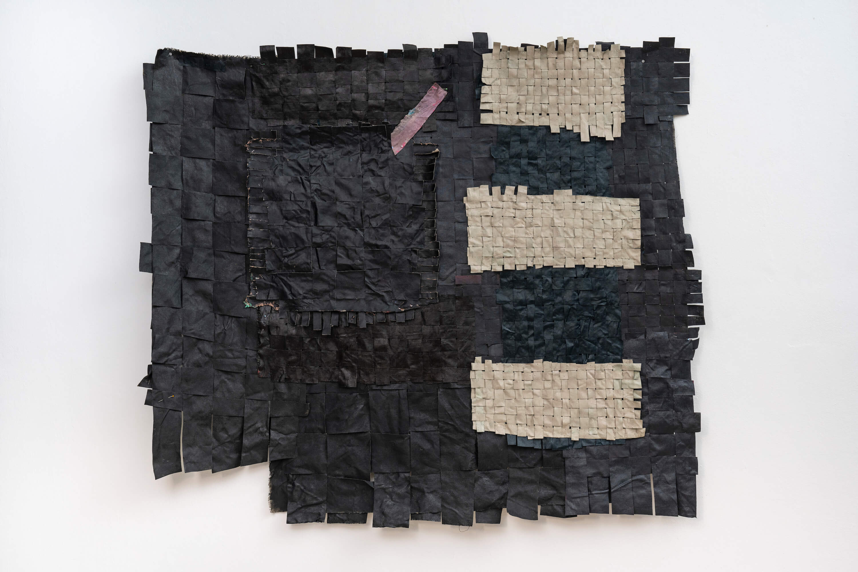 "In the window display, Jauncems presents Untitled, a piece from a recent series of works influenced by Paulinas Kaluina (1933-2017). Kaluina produced over two hundred sheets of drawings of various weaving patterns that sadly were never materialised. Intrigued by Kaluina’s personality and the playful nature of the patterns, Jauncems reinterpreted these drawings. Weaving together paper and canvas has opened the artist’s approach to painting and application techniques, allowing Jauncems to play with the language of symbols used by another person from another time."