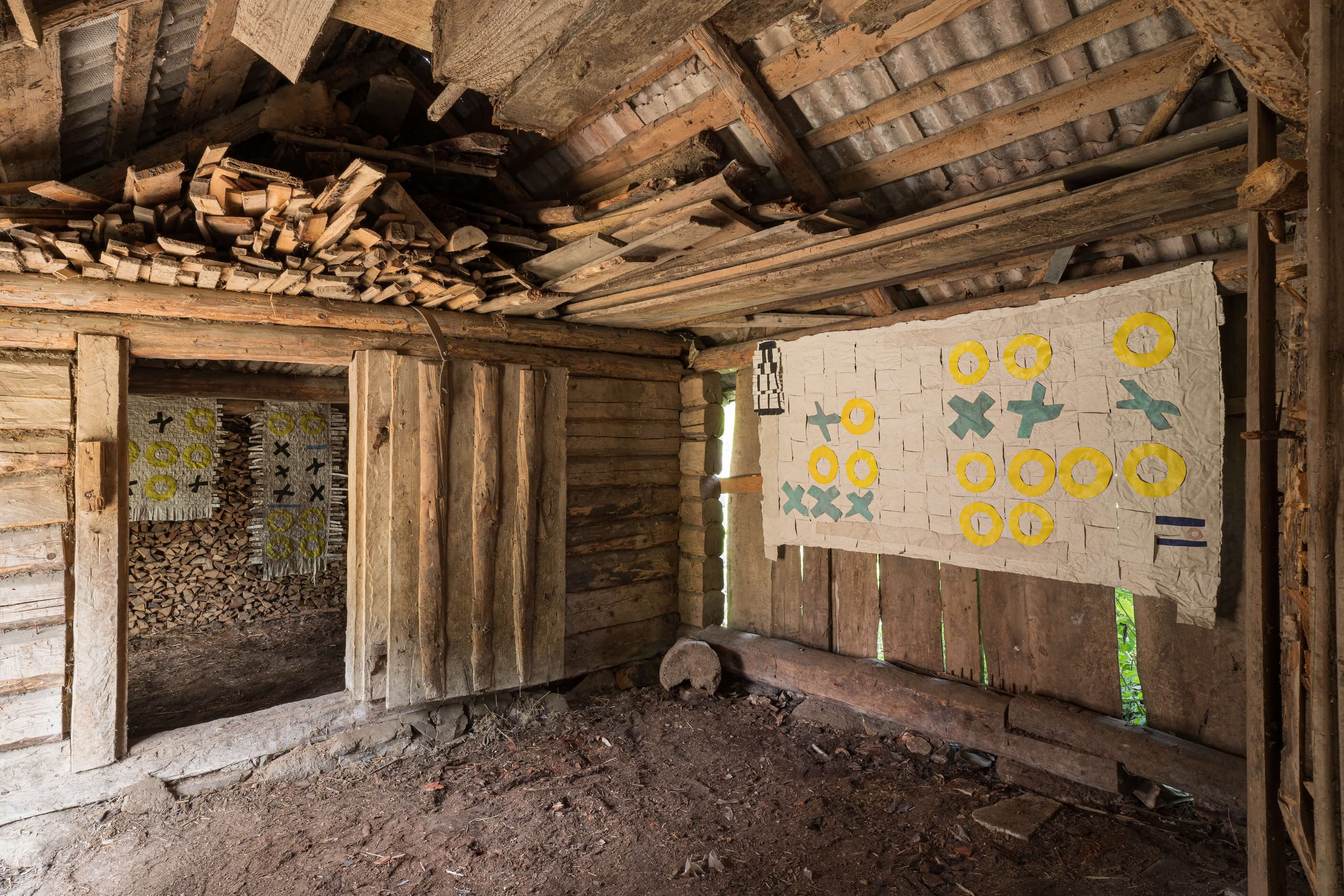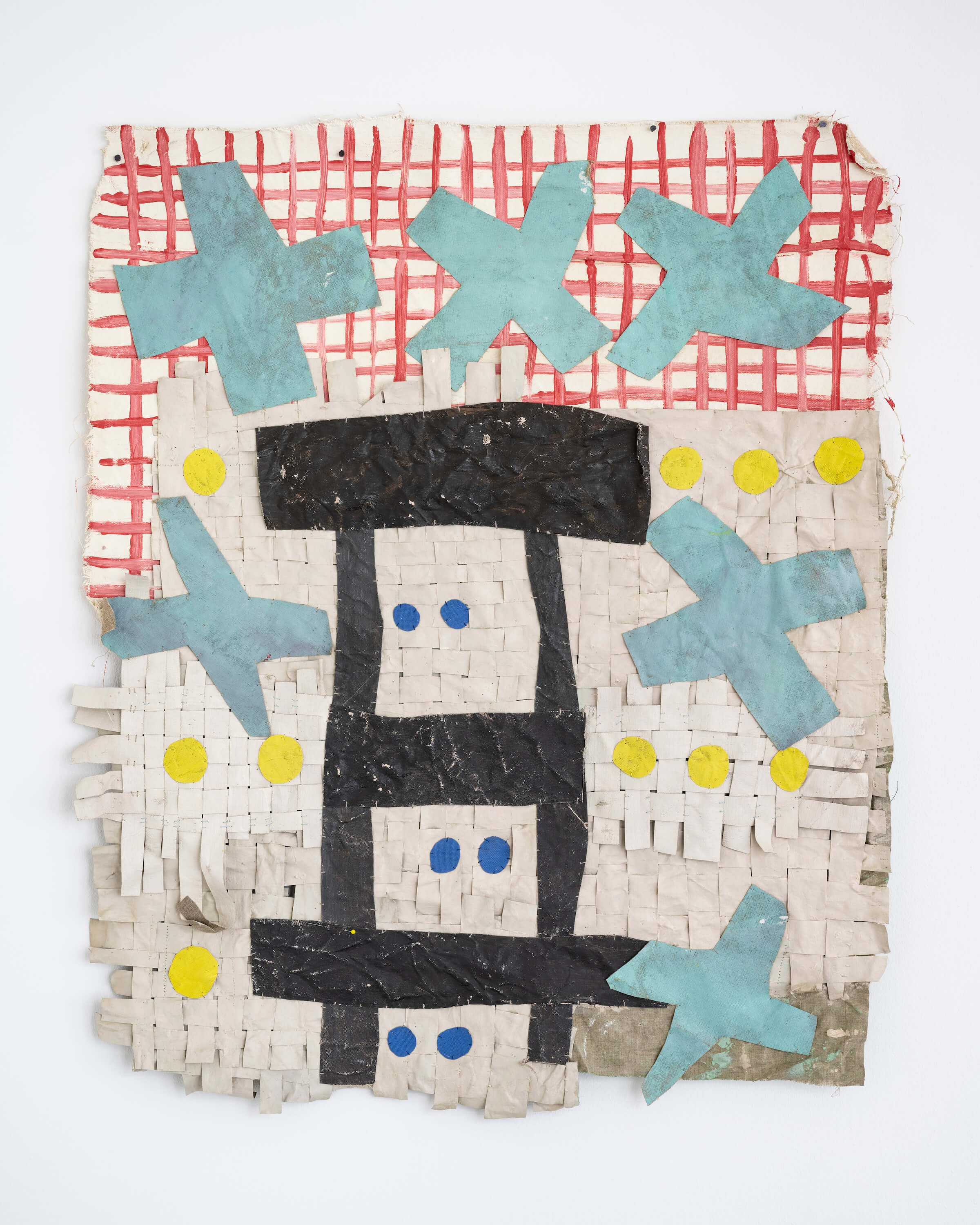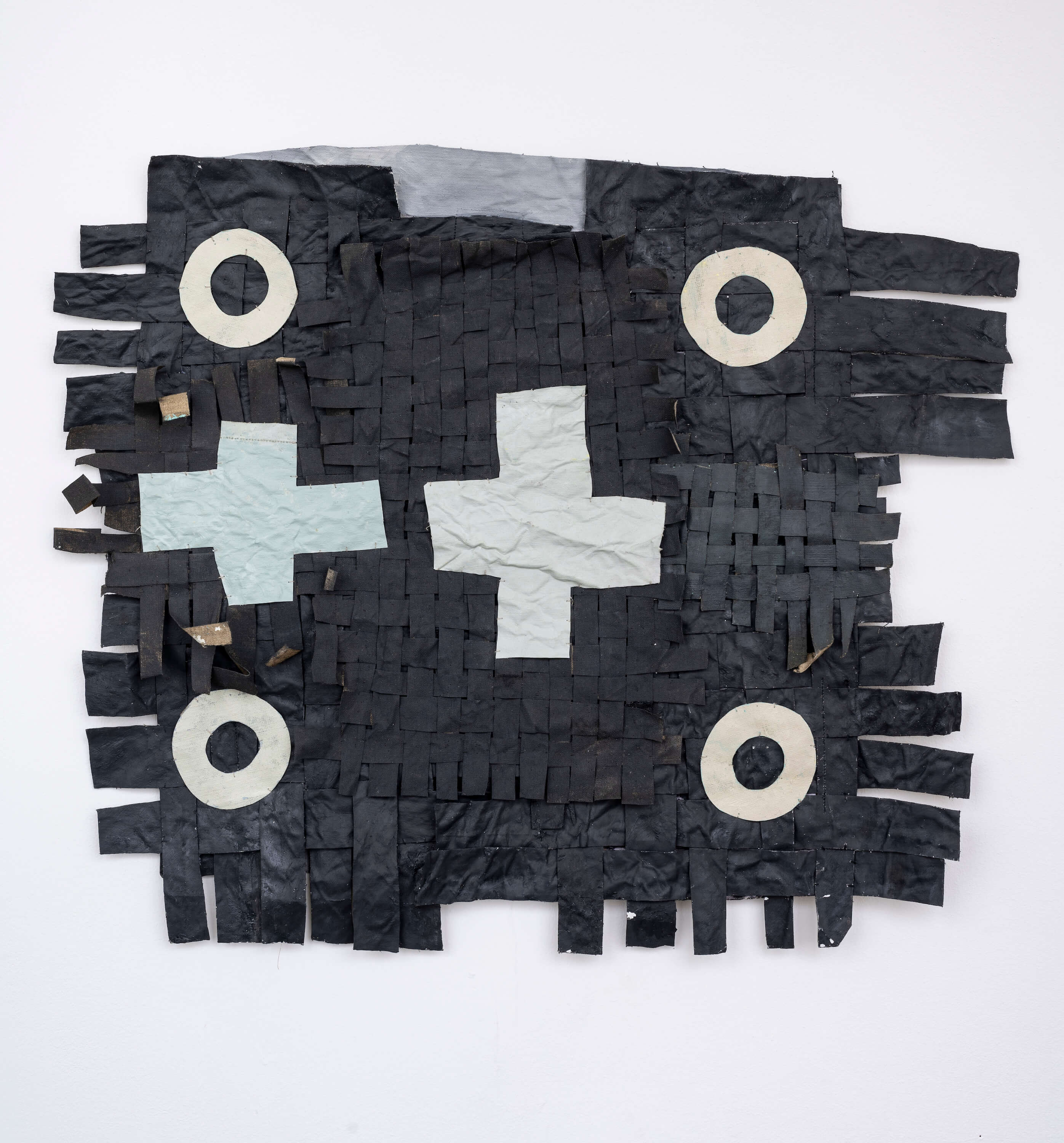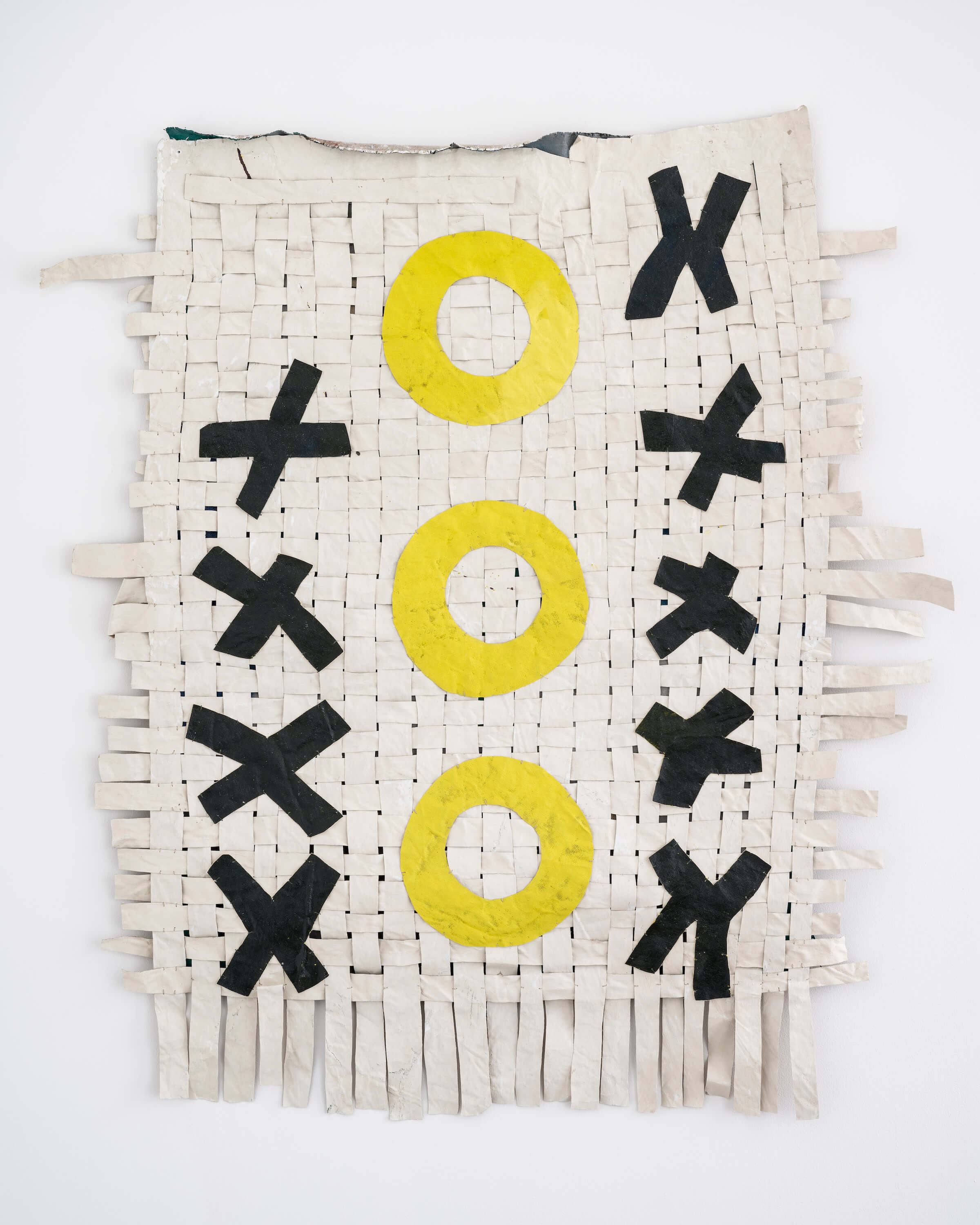 "In the window display, Jauncems presents Untitled, a piece from a recent series of works influenced by Paulinas Kaluina (1933-2017). Kaluina produced over two hundred sheets of drawings of various weaving patterns that sadly were never materialised. Intrigued by Kaluina’s personality and the playful nature of the patterns, Jauncems reinterpreted these drawings. Weaving together paper and canvas has opened the artist’s approach to painting and application techniques, allowing Jauncems to play with the language of symbols used by another person from another time."
